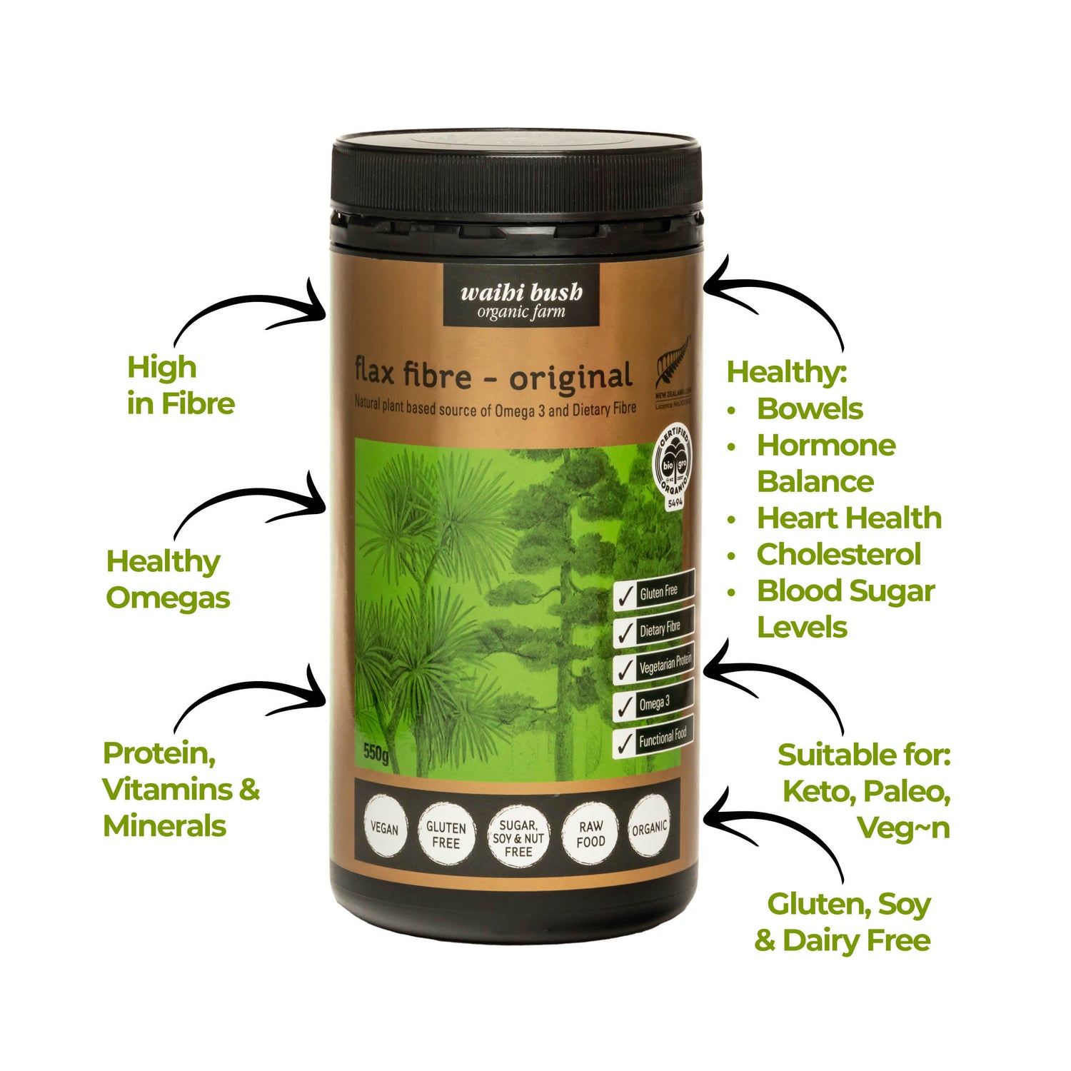 Our Waihi Bush Flax Fibre Original is a high source of natural dietary plant fibre. Milled from defatted certified organic brown linseed into a fine powder to boost your fibre