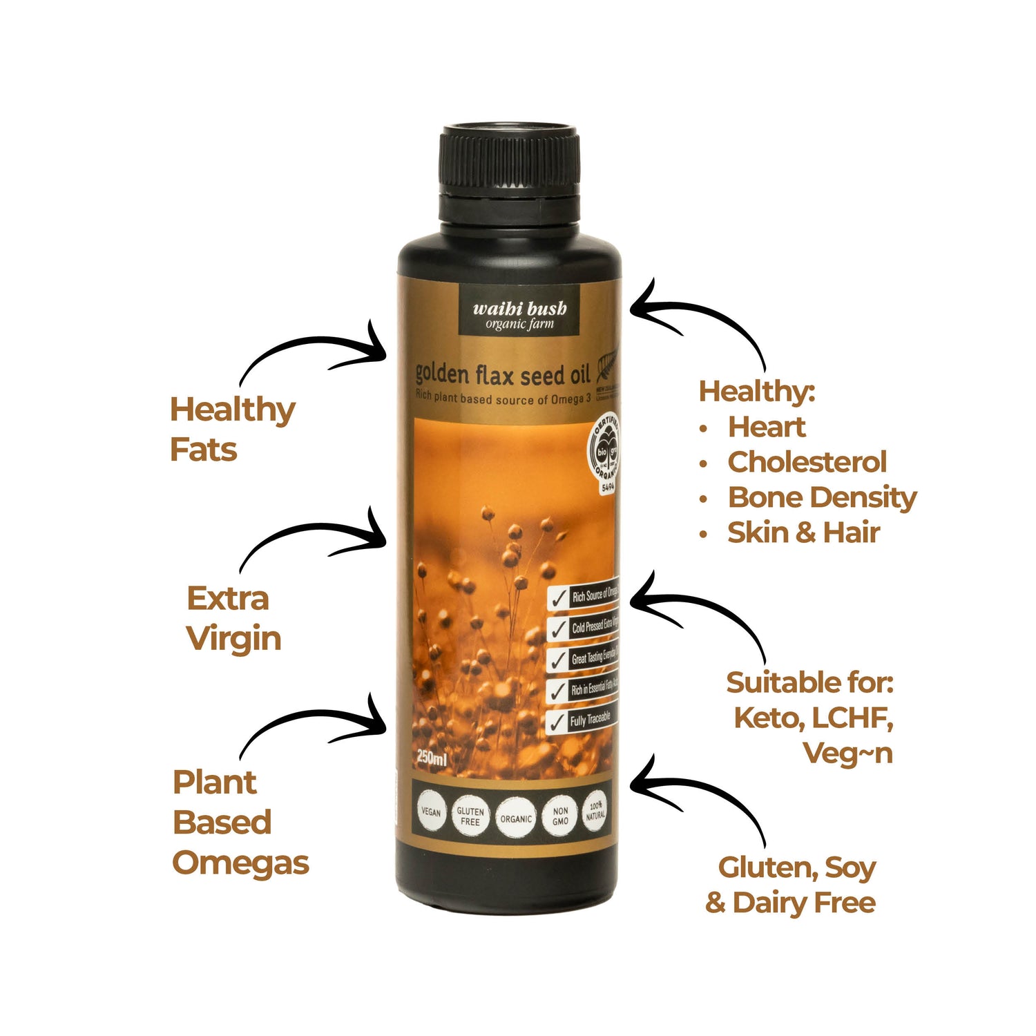 Ingredients: Certified Organic NZ Grown Cold Pressed Unrefined Extra Virgin Golden Flax Seed Oil (100%)