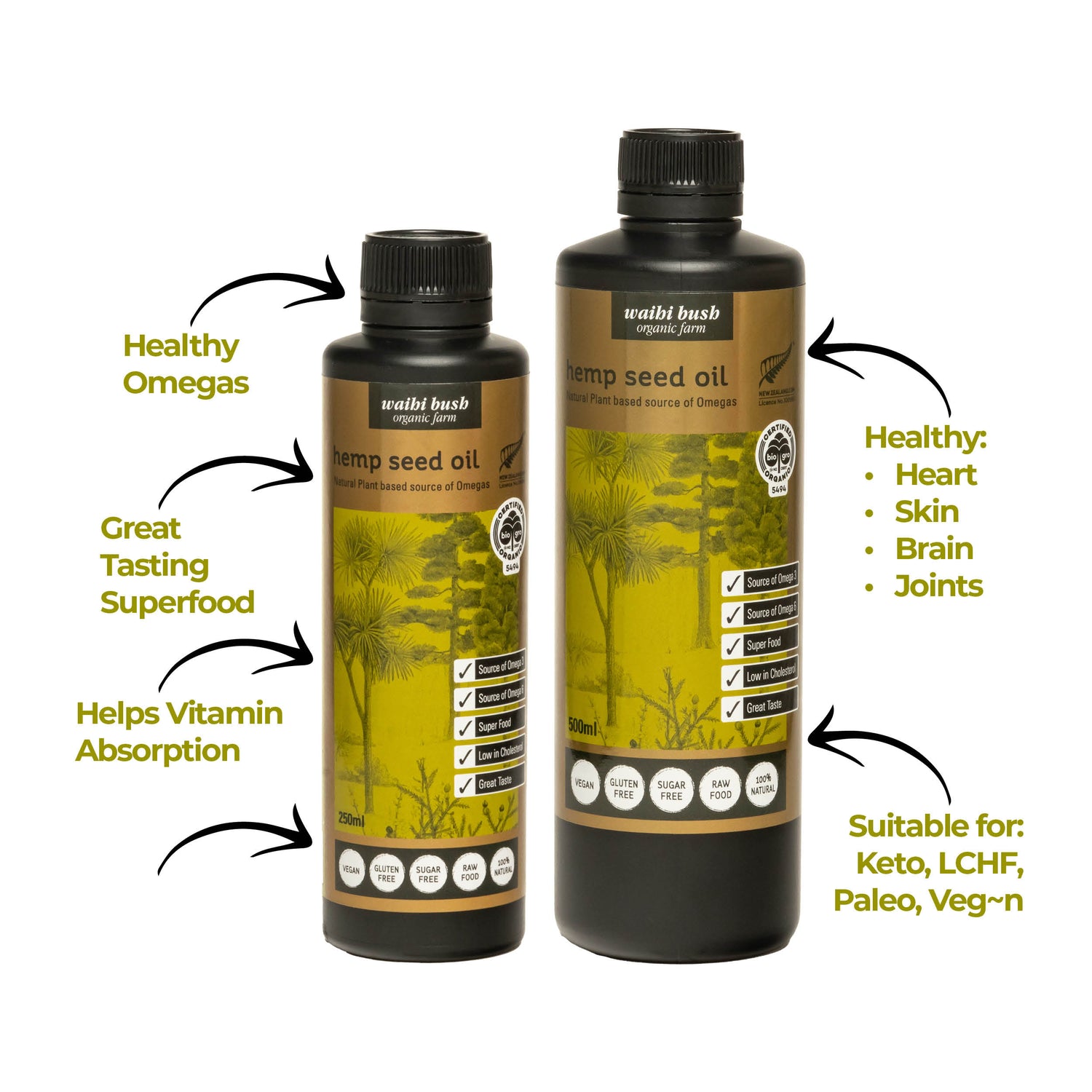Our Waihi Bush Hemp Seed Oil has been cold pressed from certified organic hemp seeds grown in the majestic Mackenzie Country which lends a great flavour and superior nutritional profile to our Hemp Seed Oil.