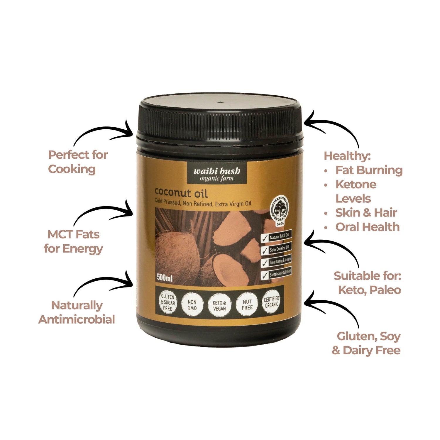 Our Coconut Oil is our only safe cooking oil in our product range. It is great tasting and versatile in it’s use. Use the coconut oil for cooking such as sautéing, frying, roasting or baking. Blend it into a smoothie or shake, or add it into your morning coffee for a great morning fat boost if following a Keto diet. Use it externally as a moisturiser, skin cleanser, natural makeup